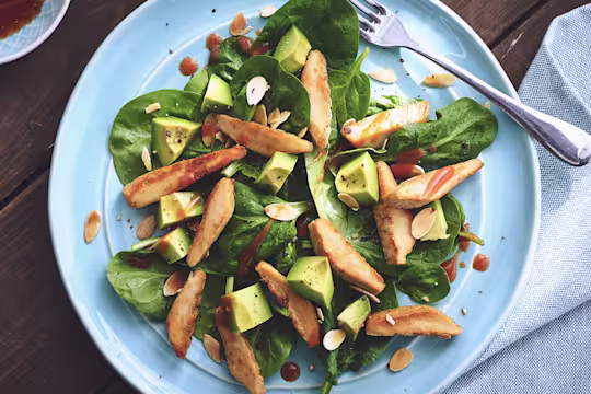 - Nu skal retten samles: fordel den friske spinat på tallerkenerne og anret de stegte skiver Quorn Fileter ovenpå. Pynt med mandler og avokadoskiver.